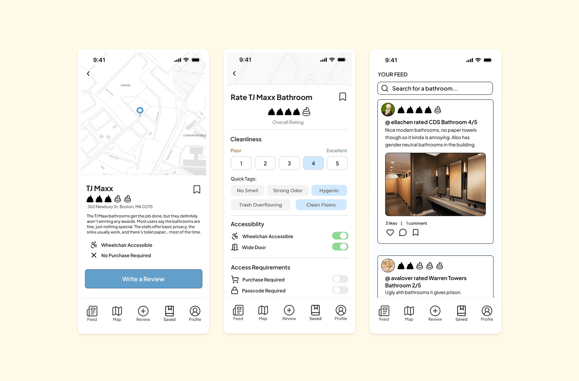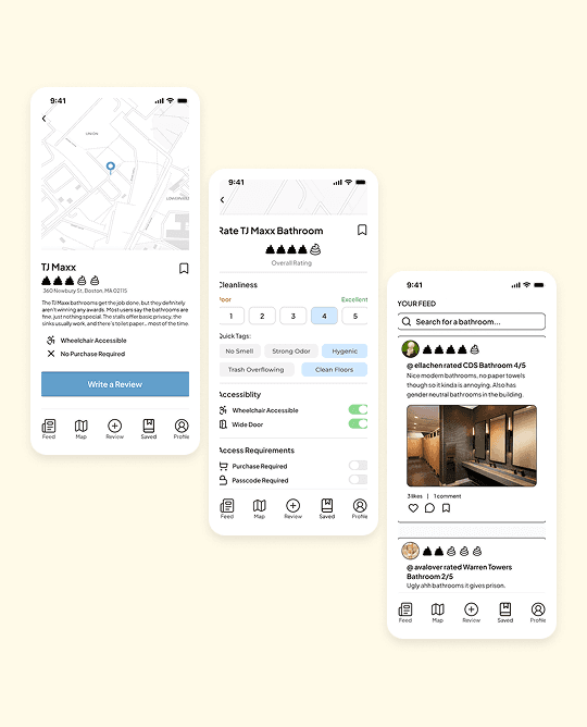 A playful, community-driven app that helps users quickly find clean, safe bathrooms in stressful, urgent situations.