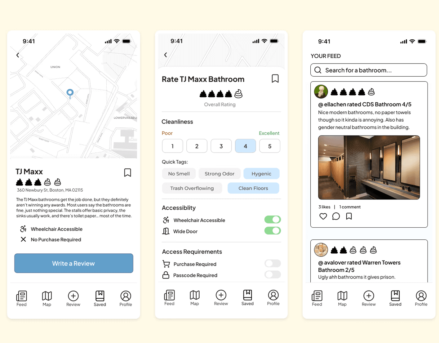 Across different settings, campus, travel, and everyday outings, they shared similar stories of urgency, stress, and uncertainty. Many described not knowing where nearby bathrooms were, whether they were open or clean, or a bad experience with a current bathroom app that ended up requiring a purchase.